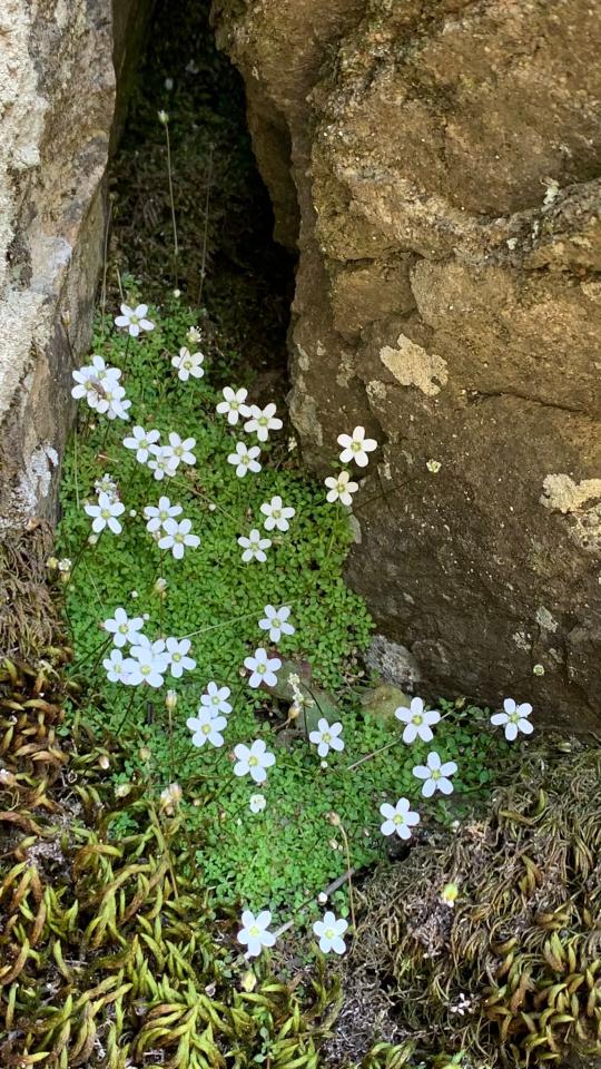 Fiorellini solitari, portati da un peduncolo eretto. Corolla con 5 petali bianchi. Fiorisce tra aprile e giugno.