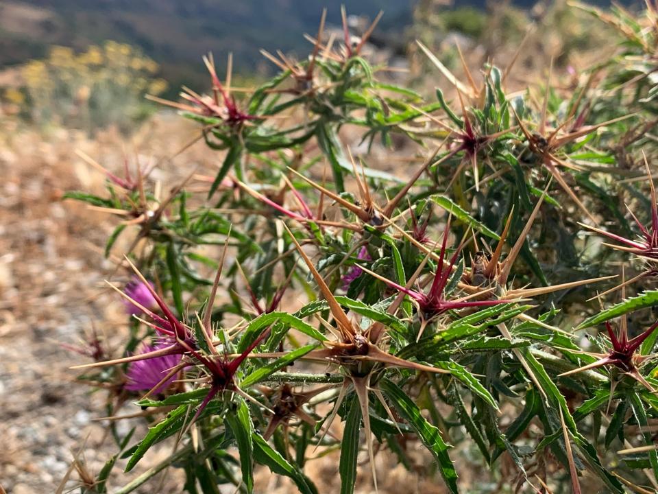 Fiori rosati o tendenti al rosso-porpora, raramente bianchi, raggiati. Capolini numerosi, ascellari o apicali, dotati all'apice di una spina mediana lunga e robusta (lunghe alcuni cm) giallognola, ampia e ben visibile, accompagnata alla base per lo più da due coppie di spine più corte e pennate (estese pochi millimetri).