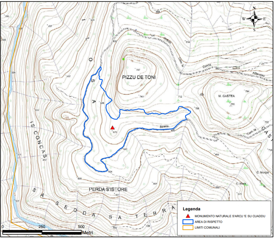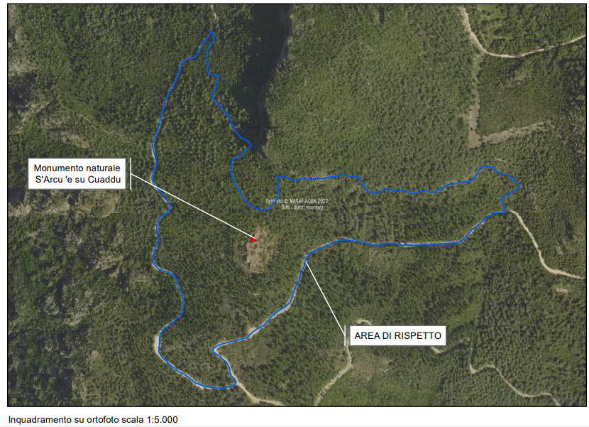 L’area di rispetto del monumento naturale “S’Arcu ‘e su Cuaddu” è identificata con una superficie totale pari a 14,42 ettari.