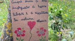 Un gesto di gratitudine per i momenti trascorsi a stretto contatto con la natura: come si capisce meglio osservando la scultura posta sul terreno e - soprattutto - leggendo i pensieri dei bambini - scritti su fogli di cartone e appesi sui grandi alberi.