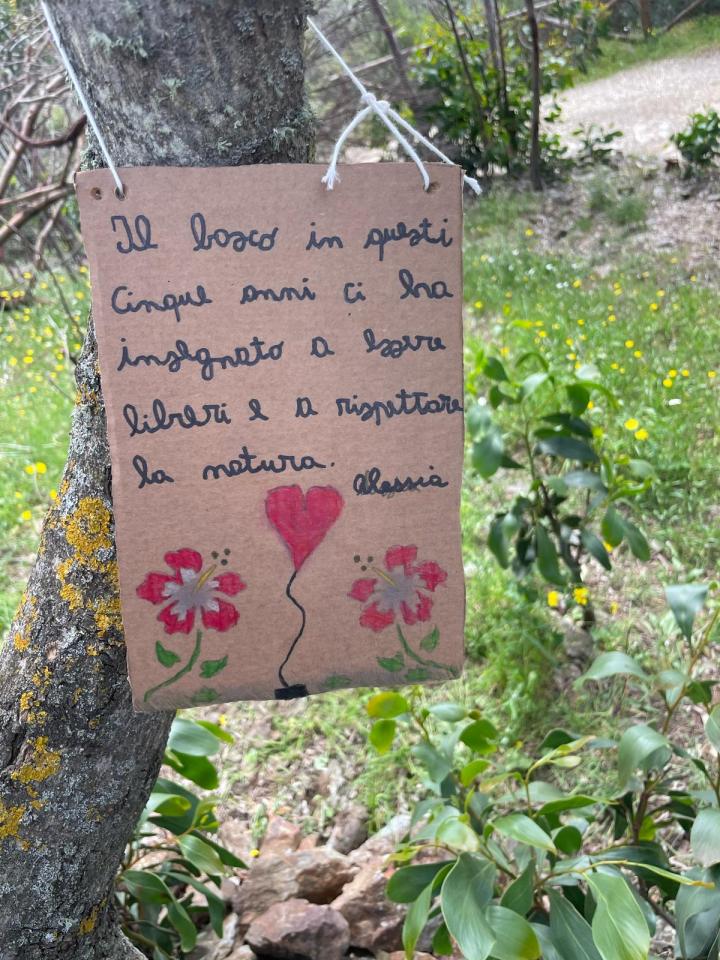 Un grande cuore di pietra realizzato sul prato, fra gli alberi del bosco al confine tra Soleminis e Dolianova (uno dei più vicini a Cagliari). E tutto intorno i pensieri dei bimbi scritti su fogli di carta, appesi al vento e al sole tra i rami degli alberi più belli.
