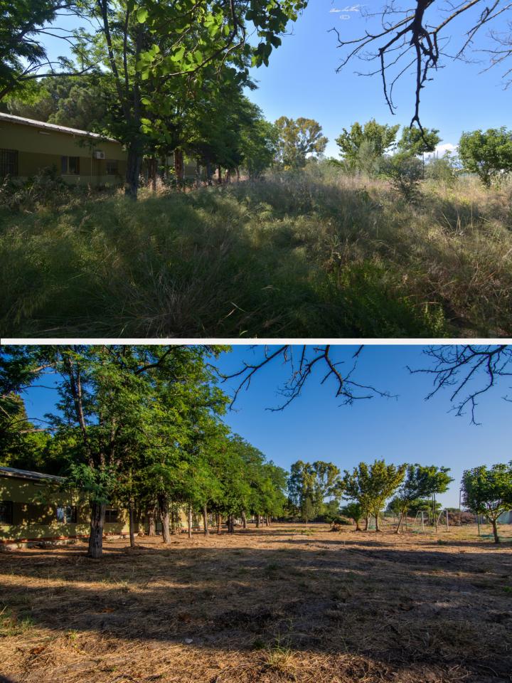 - Zona B (la parte bassa ed orientale del complesso) si presentava originariamente come un vasto prato con pochi alberi sporadici e conteneva le infrastrutture sportive tuttora presenti (campo da calcio, calcio a 5 e tennis); con esclusione del campo da tennis (in cemento) il fondo è naturale; prima dell’intervento si presentava completamente invasa da vegetazione erbacea ed arbustiva e con pochi alberi presenti che meritavano operazioni di potatura e controllo utili anche alla loro stessa stabilità;