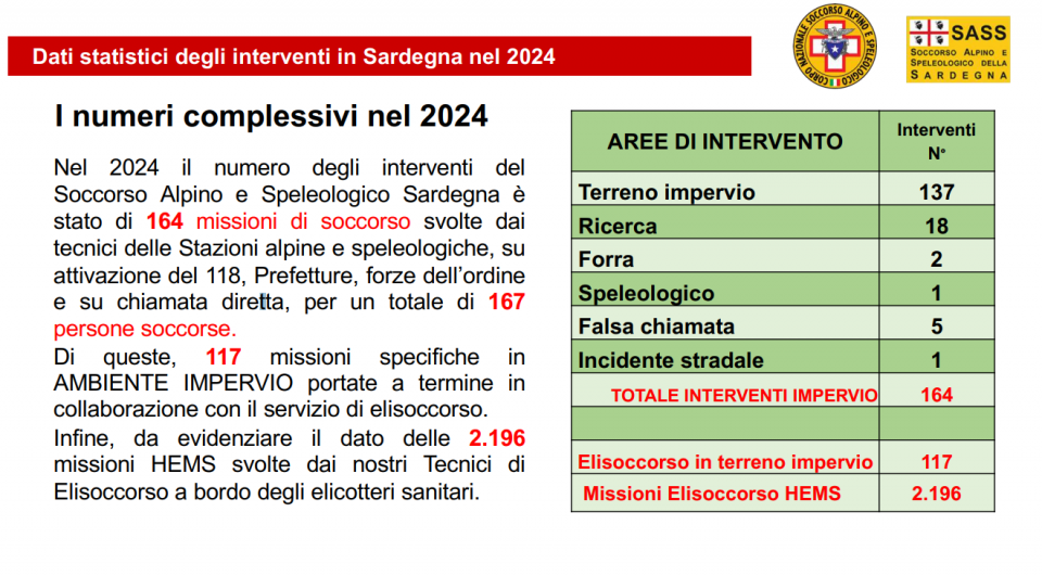 - IN SARDEGNA: sono state 164 le missioni di soccorso svolte dai tecnici delle Stazioni alpine e speleologiche (attivati dal 118, o dalle Prefetture, da Forze dell’ordine o per chiamata diretta al CNSASS) per un totale di 167 persone soccorse, con 117 missioni specifiche in ambiente impervio portate a termine incollaborazione con il servizio di elisoccorso. Da evidenziare anche il dato delle 2.196 missioni HEMS (svolte cioè dai tecnici di Elisoccorso a bordo degli elicotteri sanitari).