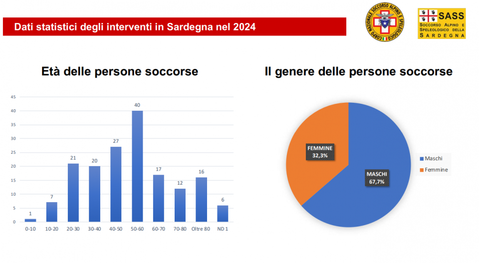 Sono 905 le giornate/uomo impegnate in Sardegna dal CNSAS, pari a 8719 ore in un anno. Complessivamente il 2024 ha registrato 164 missioni di soccorso in Sardegna per un totale di 167 persone soccorse, di cui 117 su missioni in ambiente impervio, spesso operate con elitrasporto. Cadute accidentali (45.5%) malori (12%) scivolate (10.2%) e perdita orientamento (6,6%) sono le principali cause degli incidenti in Sardegna.